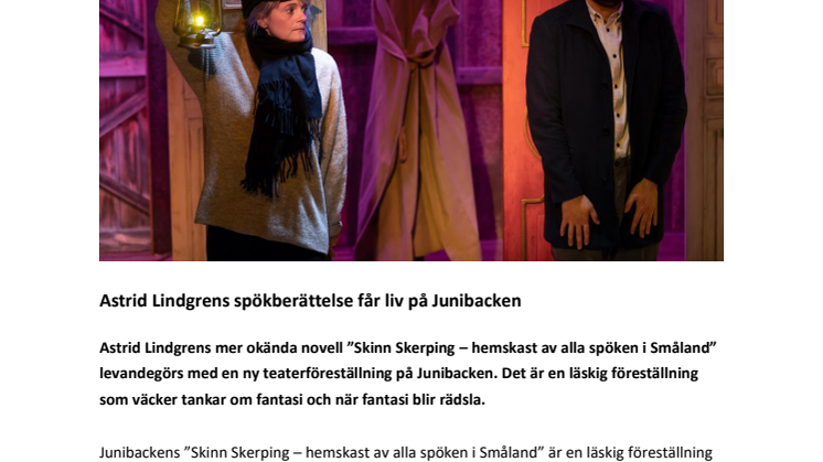 Astrid Lindgrens mer okända novell ”Skinn Skerping – hemskast av alla spöken i Småland” levandegörs med en ny teaterföreställning på Junibacken. Det är en läskig föreställning som väcker tankar om fantasi och när fantasi blir rädsla.