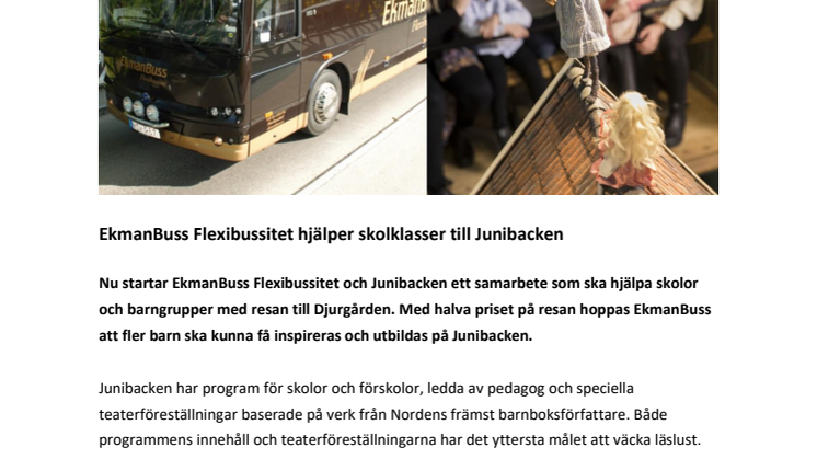 Nu startar EkmanBuss Flexibussitet och Junibacken ett samarbete som ska hjälpa skolor och barngrupper med resan till Djurgården. Med halva priset på resan hoppas EkmanBuss att fler barn ska kunna få inspireras och utbildas på Junibacken.