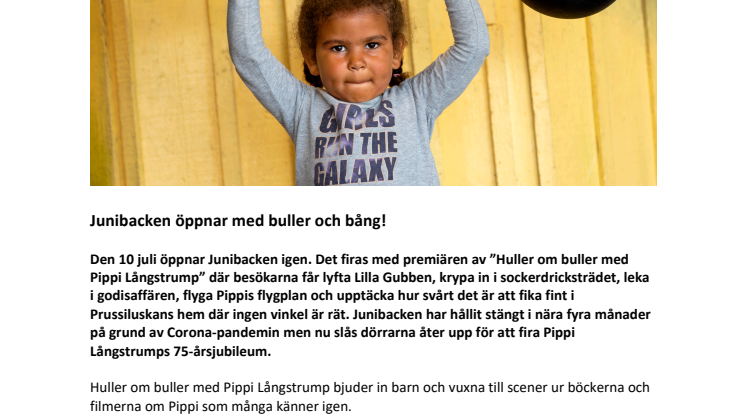 Den 10 juli öppnar Junibacken igen. Det firas med premiären av ”Huller om buller med Pippi Långstrump” där besökarna får lyfta Lilla Gubben, krypa in i sockerdricksträdet, leka i godisaffären, flyga Pippis flygplan och upptäcka hur svårt det är att fika fint i Prussiluskans hem där ingen vinkel är rät. Junibacken har hållit stängt i nära fyra månader på grund av Corona-pandemin men nu slås dörrarna åter upp för att fira Pippi Långstrumps 75-årsjubileum.