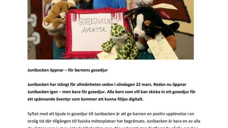 Junibacken har stängt för allmänheten sedan i söndagen 22 mars. Redan nu öppnar Junibacken igen – men bara för gosedjur. Alla barn som vill kan skicka in ett gosedjur för ett spännande äventyr som kommer att kunna följas digitalt.