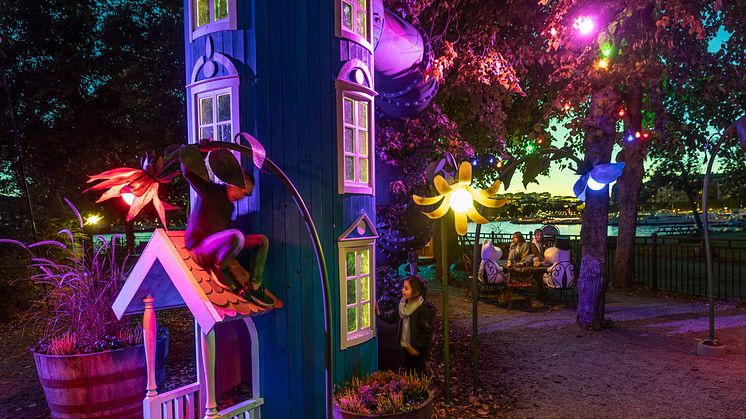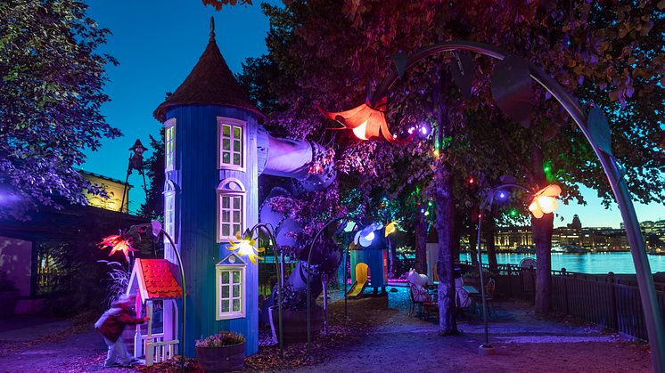 Muminlekplatsen som öppnade i somras har smyckats med ytterligare belysning som bjuder in till lek även mörka höstdagar.