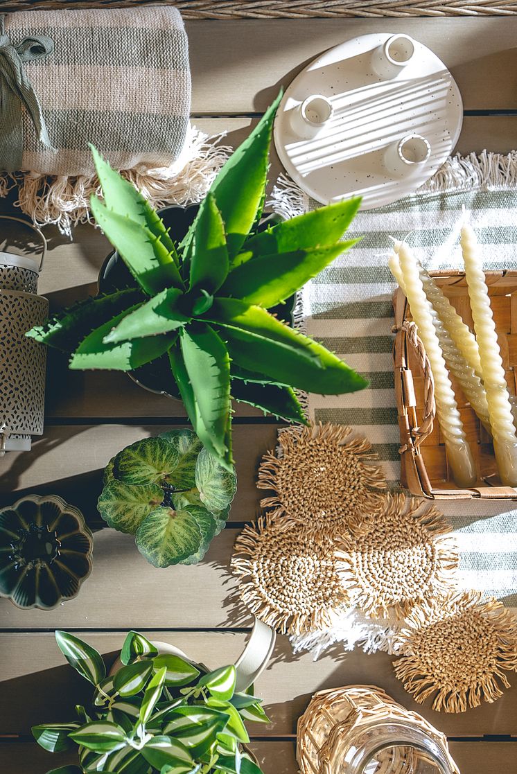 Det krävs inte så stora medel för att ta emot våren. Med hjälp av konstväxter, underlägg och filtar som flirtar med naturen skapades ett gottebord av möjligheter för den som vill smygstarta inomhus för att ha kortare startsträcka när ljuset tar över igen.