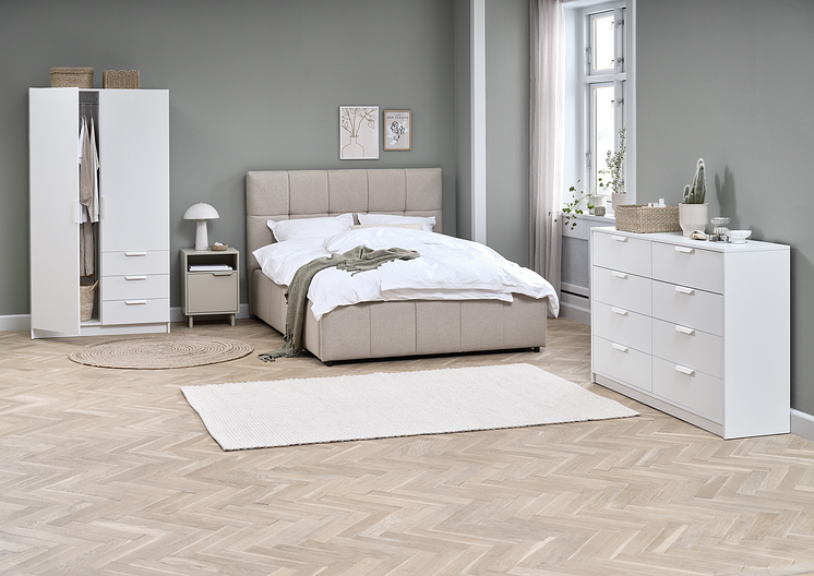 - Sängramen VEMMELEV: Erbjuder förvaring under sängen och har en ljus, tygklädd ram som skapar en ombonad känsla. Finns i flera bredder för att passa olika sovrum.