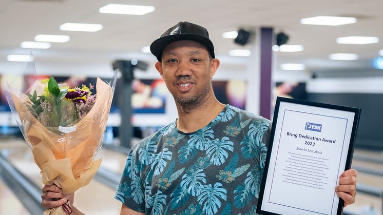 Marvin Semakala får JYSKs "Bring Dedication Award" 2023 för sitt engagemang i Bowlingföreningen Stockholm Västra IFFF. Ett pris som delas ut till någon som arbetat engagerat och målinriktat för att fler ska få tillgång till parasporten.