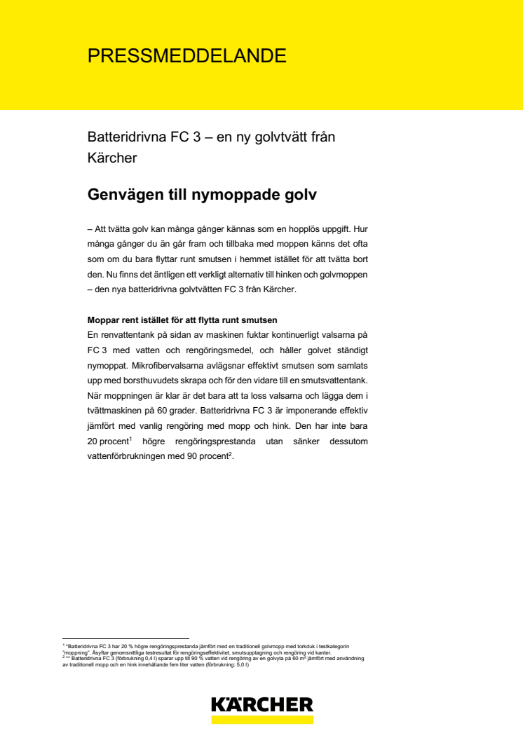 – Att tvätta golv kan många gånger kännas som en hopplös uppgift. Hur många gånger du än går fram och tillbaka med moppen känns det ofta som om du bara flyttar runt smutsen i hemmet istället för att tvätta bort den. Nu finns det äntligen ett verkligt alternativ till hinken och golvmoppen – den nya batteridrivna golvtvätten FC 3 från Kärcher.