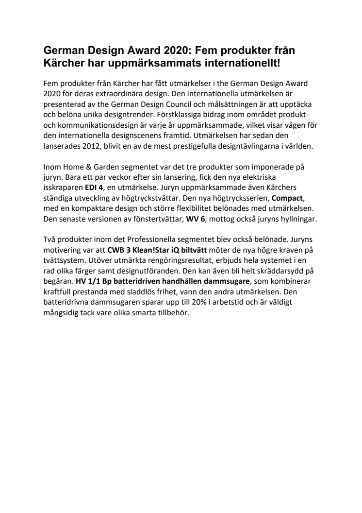 German Design Award 2020: Fem produkter från Kärcher har uppmärksammats internationellt!