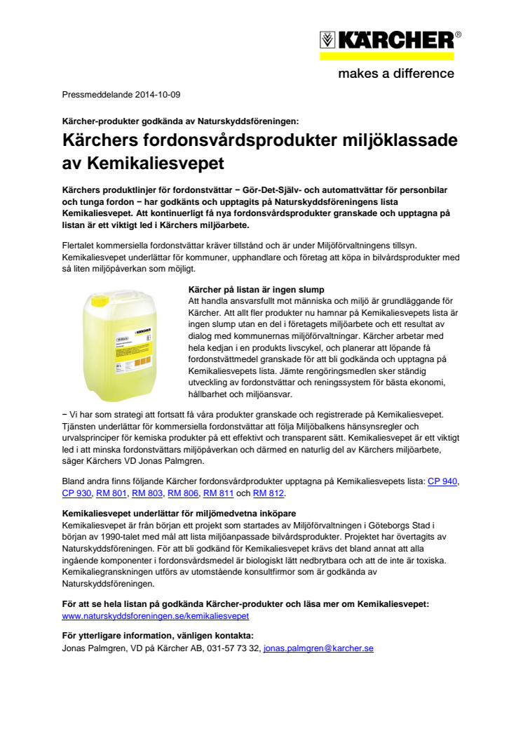 Kärchers produktlinjer för fordonstvättar har godkänts och upptagits på Naturskyddsföreningens lista Kemikaliesvepet. Att kontinuerligt få nya fordonsvårdsprodukter granskade och upptagna på listan är ett viktigt led i Kärchers miljöarbete.