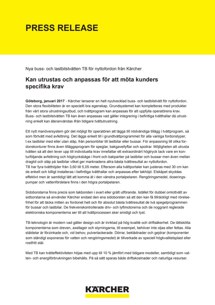 Kärcher lanserar en helt nyutvecklad buss- och lastbilstvätt för nyttofordon. Grundsystemet kan kompletteras med produkter från vårt stora utrustningsutbud, och tvättprogram kan anpassas för att uppfylla operatörens krav. Buss- och lastbilstvätten TB kan även anpassas vad gäller integrering i befintliga tvätthallar då utrustning enkelt kan återanvändas ifrån tidigare tvättutrustning.