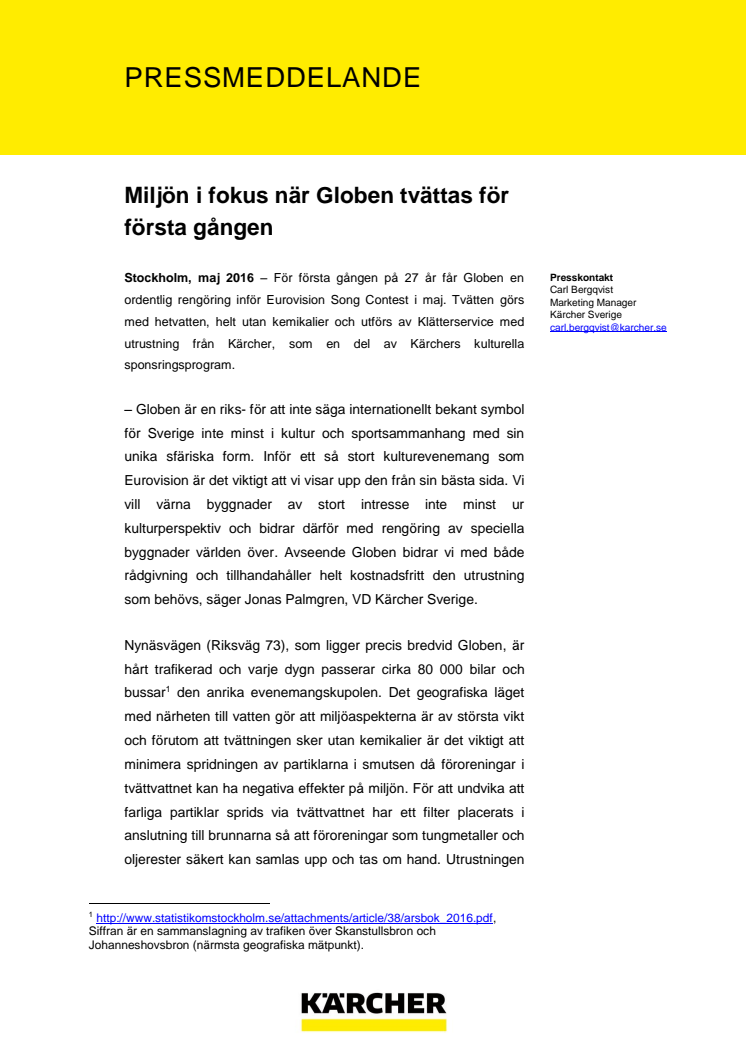 För första gången på 27 år får Globen en ordentlig rengöring inför Eurovision Song Contest i maj. Tvätten görs med hetvatten, helt utan kemikalier och utförs av Klätterservice med utrustning från Kärcher, som en del av Kärchers kulturella sponsringsprogram.