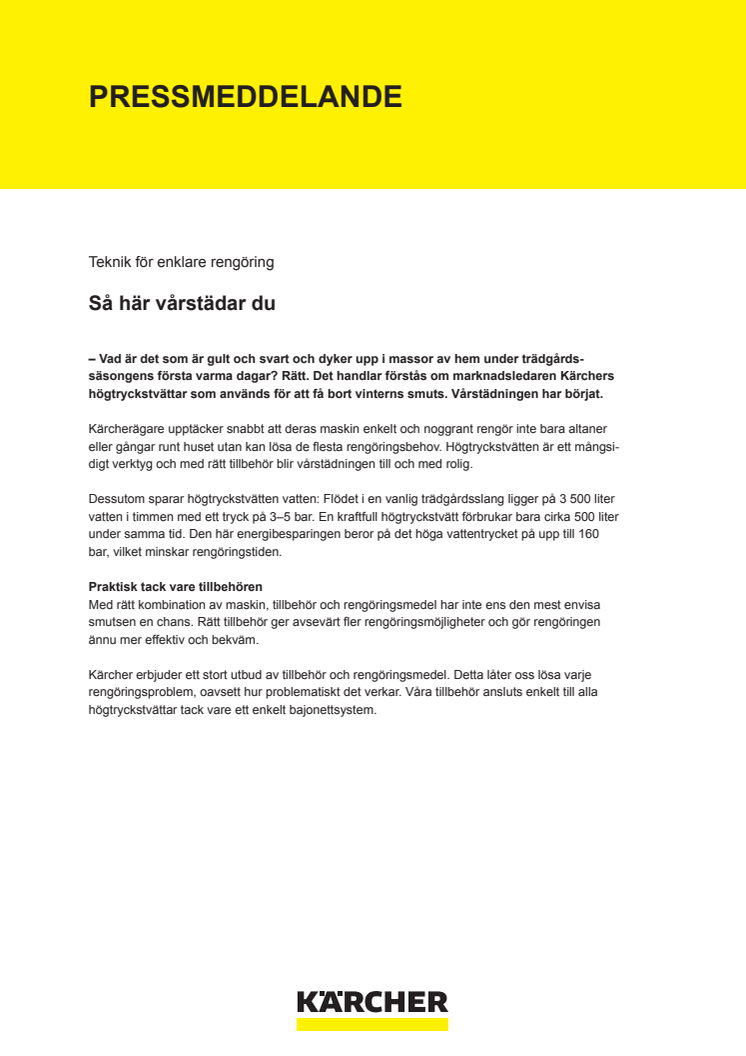 säsongens första varma dagar? Rätt. Det handlar förstås om marknadsledaren Kärchers högtryckstvättar som används för att få bort vinterns smuts. Vårstädningen har börjat.