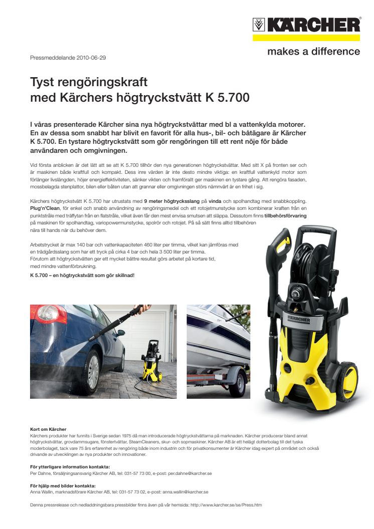 I våras presenterade Kärcher sina nya högtryckstvättar med bl a vattenkylda motorer. En av dessa som snabbt har blivit en favorit för alla hus-, bil- och båtägare är Kärcher K 5.700. En tystare högtryckstvätt som gör rengöringen till ett rent nöje för både användaren och omgivningen.
