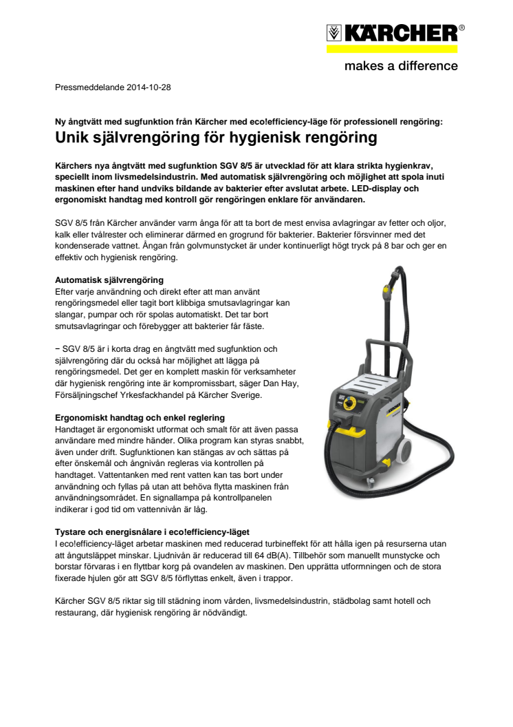 Kärchers nya ångtvätt med sugfunktion SGV 8/5 är utvecklad för att klara strikta hygienkrav, speciellt inom livsmedelsindustrin. Med automatisk självrengöring och möjlighet att spola inuti maskinen efter hand undviks bildande av bakterier efter avslutat arbete. LED-display och ergonomiskt handtag med kontroll gör rengöringen enklare för användaren.