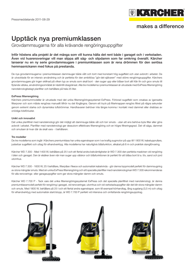Inför höstens alla projekt är det många som vill kunna hålla det rent både i garaget och i verkstaden. Även vid husrenoveringar vill man slippa allt såg- och slipdamm som far omkring överallt. Kärcher lanserar nu en ny serie grovdammsugare i premiumklassen som är rena drömmen för den seriösa hemmasnickaren med fokus på prestanda.