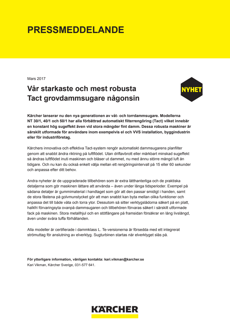 Kärcher lanserar nu den nya generationen av våt- och torrdammsugare. Modellerna NT 30/1, 40/1 och 50/1 har alla förbättrad automatiskt filterrengöring (Tact) vilket innebär en konstant hög sugeffekt även vid stora mängder fint damm. Dessa robusta maskiner är särskilt utformade för användare inom exempelvis el och VVS installation, byggindustrin eller för industriföretag.