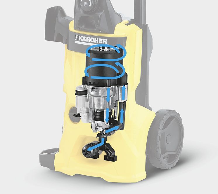 Högtryckstvätten 5.585 har vattenkyld induktionsmotor, vilket ger längre livslängd, högre energieffektivitet och lägre vikt. Dessutom blir maskinen tystare!