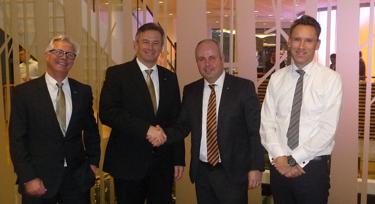 Markus Asch, Deputy Chairman of Kärcher Management Board (andra från vänster), och Henrik Langebaek (CFO Europe, Group Senior Vice President, ISS), förseglar avtalet med en handskakning. Tillsammans med i bilden: Marc Van Ingelgem (Vice President Global Sales Management Professional Products, Kärcher, vänster) och Peter Schack (Head of Group Procurement, ISS, höger).