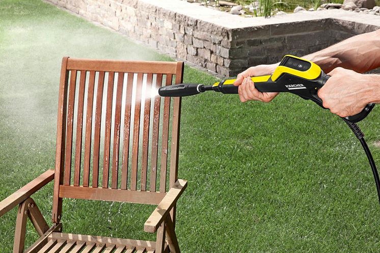 Med högtryckstvätten rengör du även trädgårdsmöblerna snabbt och grundligt. Kärchers nya serie Full Control har en display som visar om det inställda vattentrycket matchar den aktuella arbetsuppgiften.