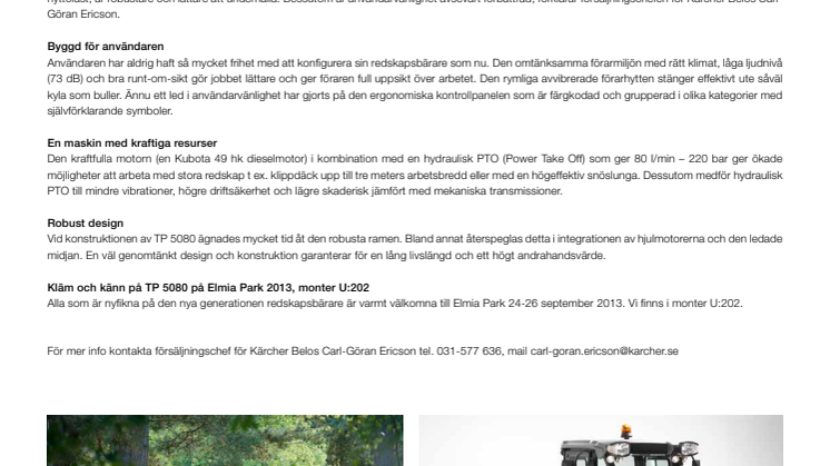Med utgångspunkt från våra kunders behov och krav har vi tillsammans med våra ingenjörer skapat den nya generationen redskapsbärare som ger långsiktig trygghet för professionella markvårdares behov, året runt. Jämfört med föregångaren TransPro 4560 har nya TransPro 5080 mer kraft, högre nyttolast, är robustare och lättare att underhålla. Dessutom är användarvänlighet avsevärt förbättrad, förklarar försäljningschefen för Kärcher Belos Carl-Göran Ericson.