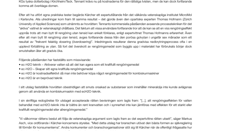 ”Vi välkomnar rättens beslut att följa de vetenskapliga argument som lagts fram av det expertvittne rätten utsett”, säger Markus Asch, vice ordförande i Kärcher-koncernens styrelse. ”Med detta utslag har branschen utövat den bästa formen av självreglering till förmån för konsumenterna”. Andra konkurrenter och branschorganisationer slöt sig till Kärcher när de offentligt ifrågasatte hur effektivt ecH2O var och utförde också vetenskapliga studier och praktiska tester.