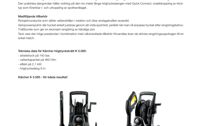 Den nya K 5.585 har mycket att erbjuda den flitiga användaren med mycket hjälpsamma utrustningsdetaljer som till exempel vattenkyld motor, en smidig slangupprullare, Variopowerspolrör, Rotojetmunstycke och tvättborste. Den vattenkylda motorn förlänger livslängden, höjer energieffektiviteten, sänker vikten och ger framförallt högtryckstvätten en tystare gång. Att rengöra fasaden, mossbelagda stenplattor, bilen eller båten utan att grannar eller omgivningen störs nämnvärt är en frihet i sig.
