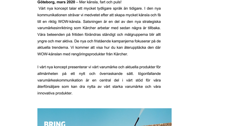 Vårt nya koncept talar ett mycket tydligare språk än tidigare. I den nya kommunikationen strävar vi medvetet efter att skapa mycket känsla och få till en riktig WOW-känsla. Satsningen är en del av den nya strategiska varumärkesinriktning som Kärcher arbetar med sedan några år tillbaka. Våra beteenden på fritiden förändras ständigt och målgrupperna blir allt yngre och mer aktiva. De nya och fristående kampanjerna fokuserar på de aktuella trenderna. Vi kommer att visa hur du kan återupptäcka den där WOW-känslan med rengöringsprodukter från Kärcher.