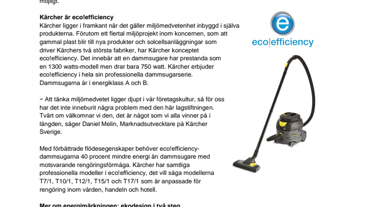 Kärcher har länge varit en förespråkare av att städa effektivt med lägre energiåtgång. Nu när EU:s första del av ekodesignförordningen för dammsugare trätt i kraft 1 september 2014 är Kärcher redo för den nya lagstiftningen med A-klassade dammsugare.