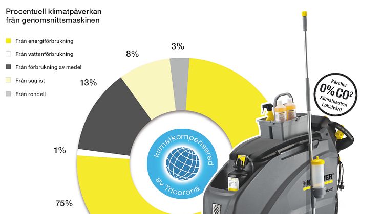 Rengöring helt utan kem och rengöringsmedel har ökat kraftigt i popularitet, vilket på ytan skulle kunna anses bra för miljön. Det många inte vet är att vatten och rengöringsmedel endast står för 14 procent av den miljöbelastning som en skurmaskin orsakar. Den stora boven i dramat är maskinernas energiförbrukning, som står för ca 75 procent av miljöbelastningen. Med det i åtanke har Kärcher tagit fram konceptet Klimatneutral lokalvård, ett initiativ de är ensamma om.