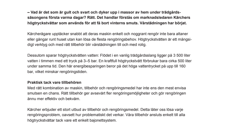 säsongens första varma dagar? Rätt. Det handlar förstås om marknadsledaren Kärchers högtryckstvättar som används för att få bort vinterns smuts. Vårstädningen har börjat.