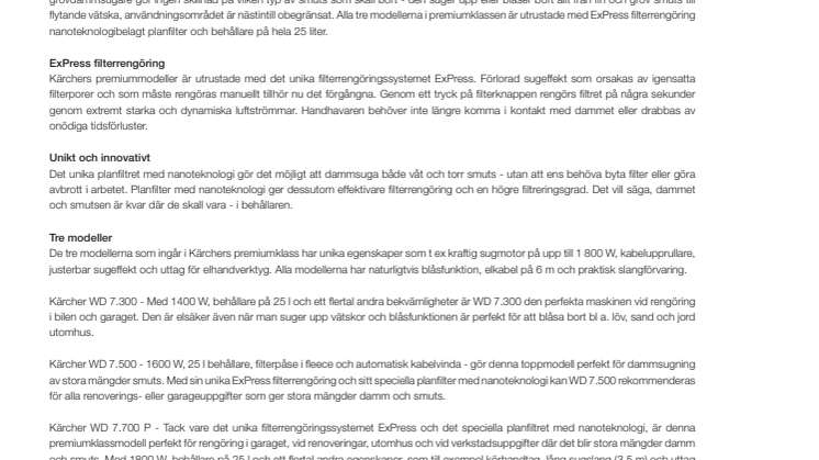 De nya grovdammsugarna i premiumklassen dammsuger både vått och torrt med konstant hög sugeffekt och utan avbrott i arbetet. De är utvecklade för en intensiv användning och är perfekta för den ambitiösa ”gör-det-självaren” med större rengöringsuppgifter. Kärchers grovdammsugare gör ingen skillnad på vilken typ av smuts som skall bort - den suger upp eller blåser bort allt från fin och grov smuts till flytande vätska, användningsområdet är nästintill obegränsat. Alla tre modellerna i premiumklassen är utrustade med ExPress filterrengöring nanoteknologibelagt planfilter och behållare på hela 25 liter.
