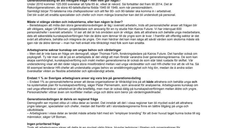 – Beredskapen att möta den stora generationsväxlingen är låg i svenskt arbetsliv, trots att personalchefer anser att frågan blir allt viktigare, säger Ulf Boman, projektledare och ansvarig för en ny studie från Kairos Future. Vi har intervjuat 600 personalchefer i svenskt arbetsliv. Vi ser att det är två områden som är viktiga: dels att attrahera och behålla unga medarbetare, dels att säkerställa kunskapsöverföringen från de äldre som lämnar till de yngre som är kvar. I framför allt offentlig sektor är det svårt att attrahera, behålla och integrera de yngre. Om man hårdrar det kan man säga att såväl vården som skolorna måste slå igen när de äldre lämnar – man har helt enkelt inte tillräckligt med folk som kan ersätta.