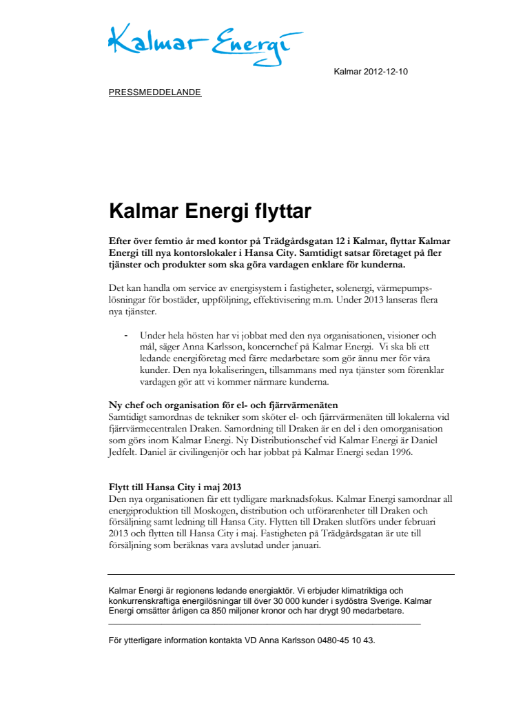Efter över femtio år med kontor på Trädgårdsgatan 12 i Kalmar, flyttar Kalmar Energi till nya kontorslokaler i Hansa City. Samtidigt satsar företaget på fler tjänster och produkter som ska göra vardagen enklare för kunderna.