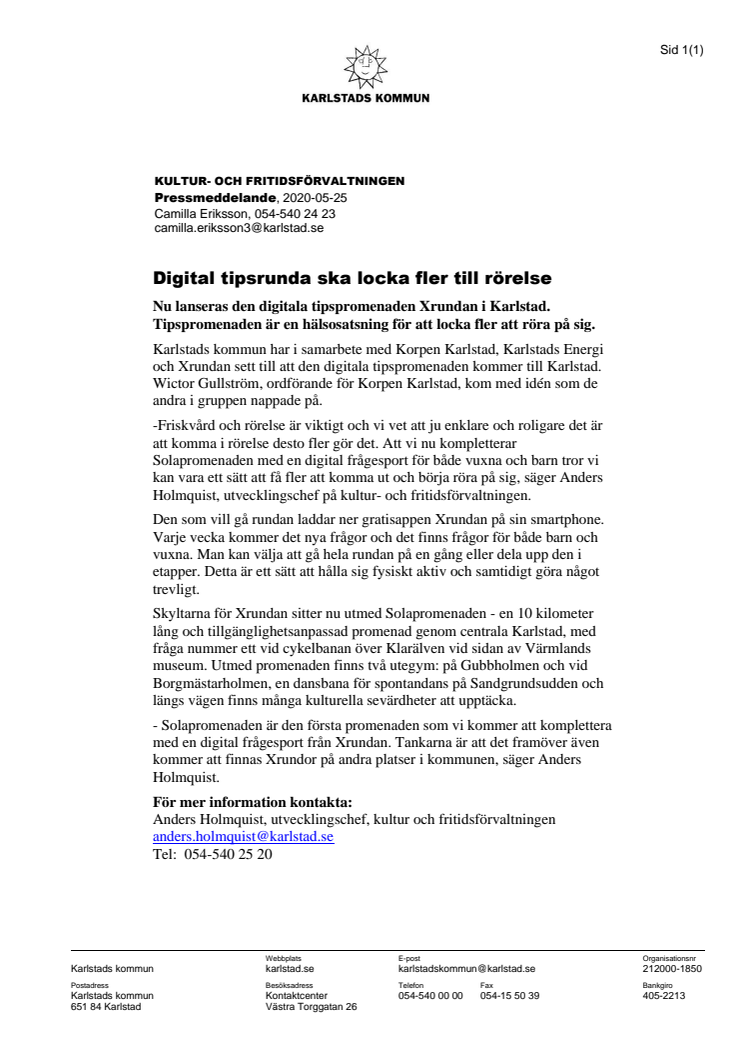 Nu lanseras den digitala tipspromenaden Xrundan i Karlstad. Tipspromenaden är en hälsosatsning för att locka fler att röra på sig.