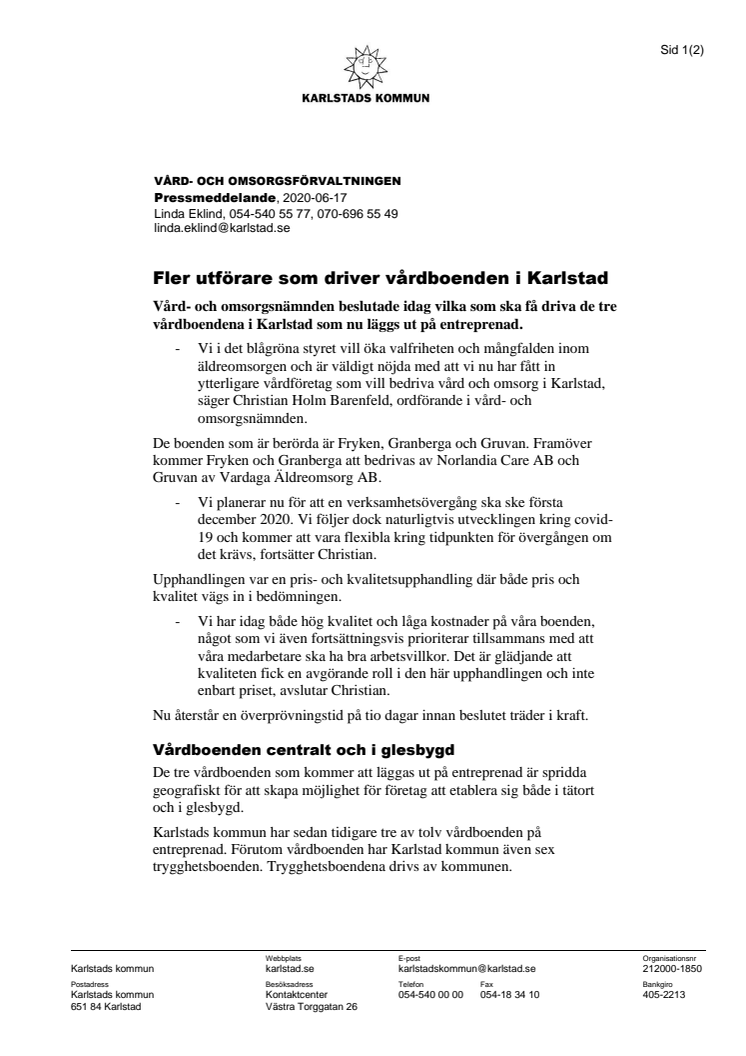 Vård- och omsorgsnämnden beslutade idag vilka som ska få driva de tre vårdboendena i Karlstad som nu läggs ut på entreprenad.