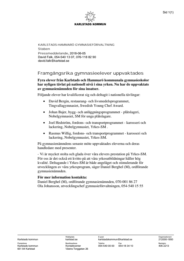 Fyra elever från Karlstads och Hammarö kommunala gymnasieskolor har nyligen tävlat på nationell nivå i sina yrken. Nu har de uppvaktats av gymnasienämnden för fina insatser.