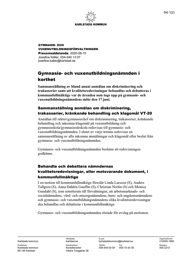 Sammanställning av bland annat anmälan om diskriminering och trakasserier samt att kvalitetsredovisningar behandlas och debatteras i kommunfullmäktige var de ärenden som togs upp på gymnasie- och vuxenutbildningsnämndens möte den 17 juni.