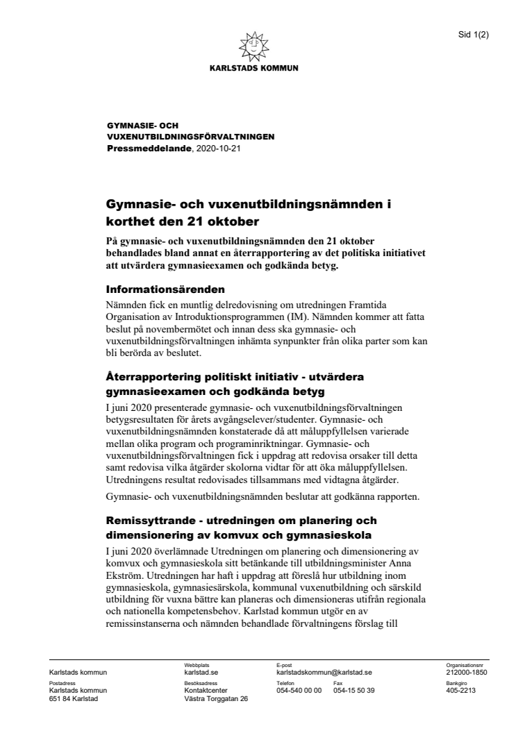 Gymnasie- och vuxenutbildningsnämnden i korthet den 21 oktober