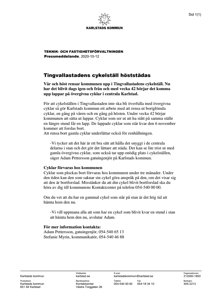 Vår och höst rensar kommunen upp i Tingvallastadens cykelställ. Nu har det blivit dags igen och från och med vecka 42 börjar det komma upp lappar på övergivna cyklar i centrala Karlstad.