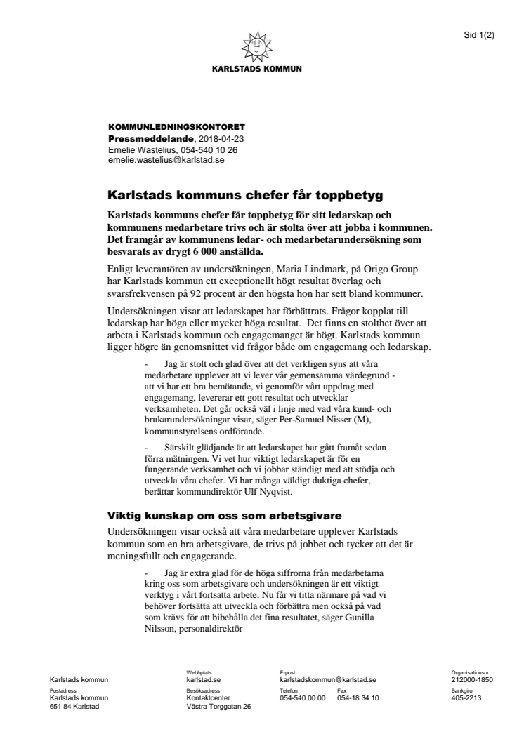 Karlstads kommuns chefer får toppbetyg för sitt ledarskap och kommunens medarbetare trivs och är stolta över att jobba i kommunen. Det framgår av kommunens ledar- och medarbetarundersökning som besvarats av drygt 6 000 anställda.