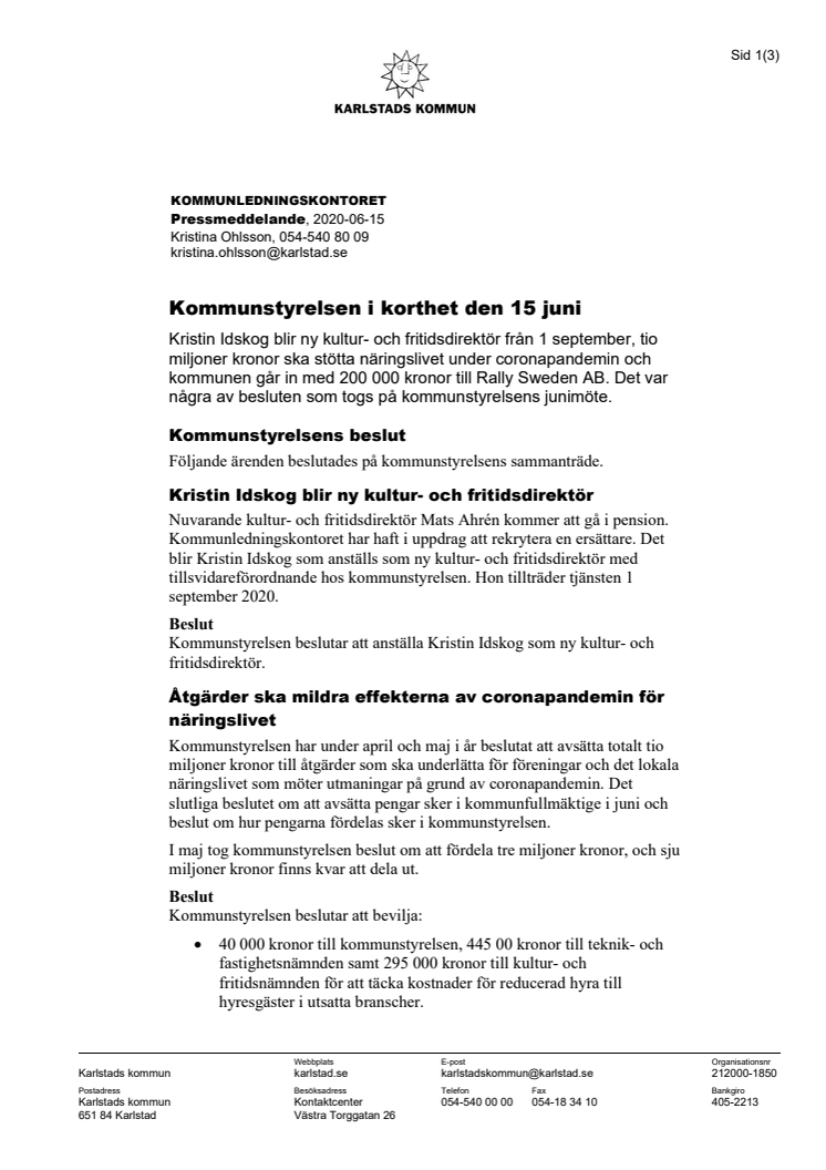Kristin Idskog blir ny kultur- och fritidsdirektör från 1 september, tio miljoner kronor ska stötta näringslivet under coronapandemin och kommunen går in med 200 000 kronor till Rally Sweden AB. Det var några av besluten som togs på kommunstyrelsens junimöte.