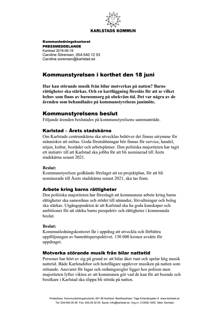Hur kan störande musik från bilar motverkas på natten? Barns rättigheter ska stärkas. Och en kartläggning föreslås för att se vilket behov som finns av barnomsorg på obekväm tid. Det var några av de ärenden som behandlades på kommunstyrelsens junimöte.
