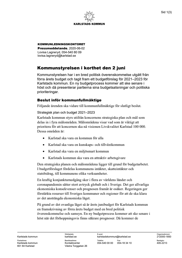 Kommunstyrelsen har i en bred politisk överenskommelse utgått från förra årets budget och tagit fram ett budgetförslag för 2021–2023 för Karlstads kommun. En ny budgetprocess kommer att ske senare i höst och då presenterar partierna sina budgetsatsningar och politiska prioriteringar.