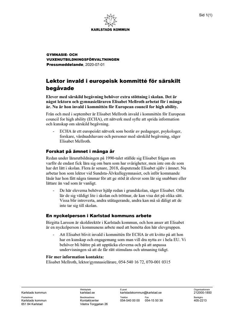 Elever med särskild begåvning behöver extra stöttning i skolan. Det är något lektorn och gymnasieläraren Elisabet Mellroth arbetat för i många år. Nu är hon invald i kommittén för European council for high ability.