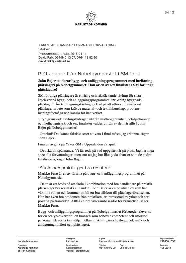 John Bajer studerar bygg- och anläggningsprogrammet med inriktning plåtslageri på Nobelgymnasiet. Han är en av sex finalister i SM för unga plåtslagare!