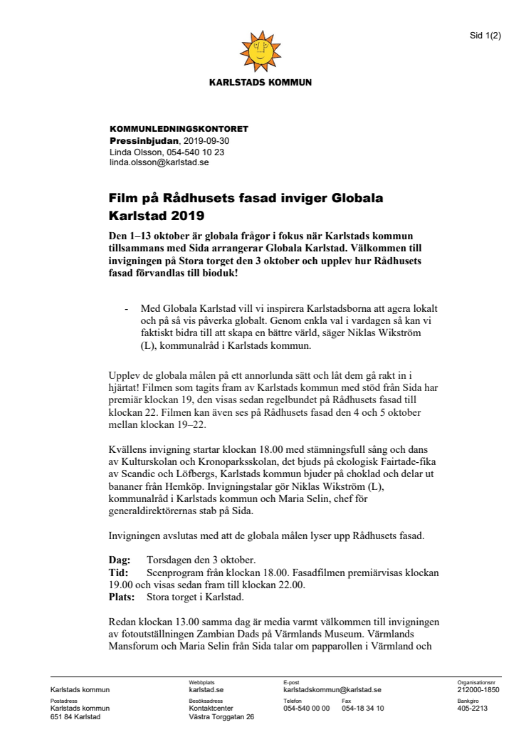 Den 1–13 oktober är globala frågor i fokus när Karlstads kommun tillsammans med Sida arrangerar Globala Karlstad. Välkommen till invigningen på Stora torget den 3 oktober och upplev hur Rådhusets fasad förvandlas till bioduk!