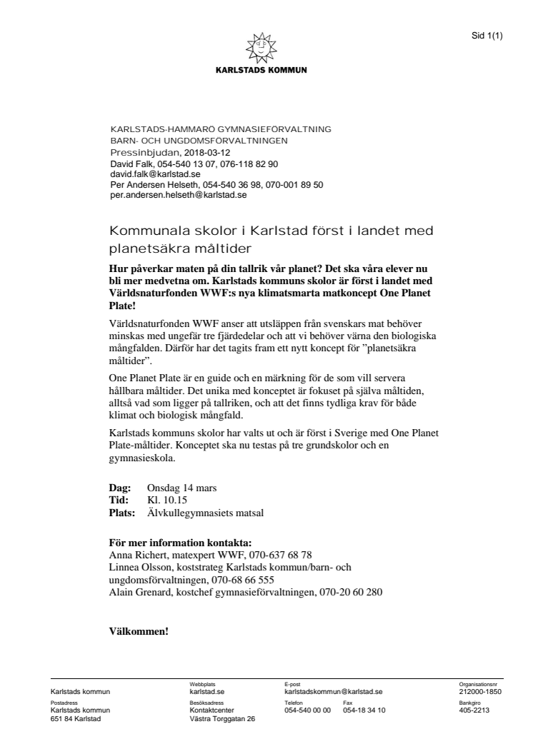 Pressinbjudan: Kommunala skolor i Karlstad först i landet med planetsäkra måltider