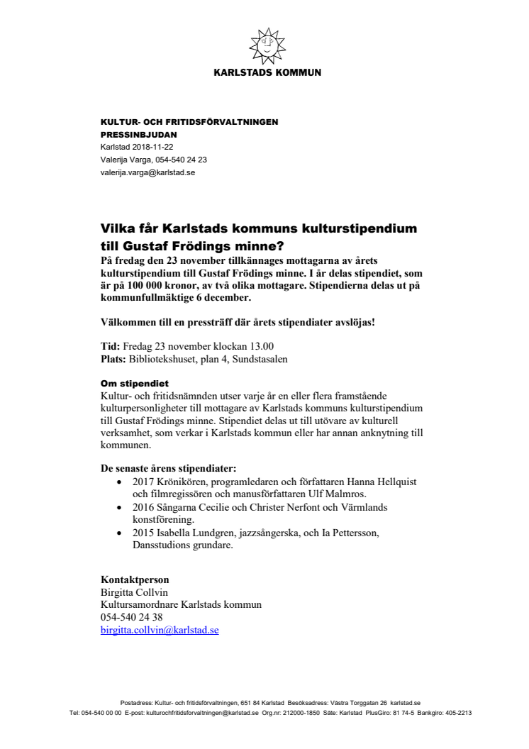 På fredag den 23 november tillkännages mottagarna av årets kulturstipendium till Gustaf Frödings minne. I år delas stipendiet, som är på 100 000 kronor, av två olika mottagare. Stipendierna delas ut på kommunfullmäktige 6 december.