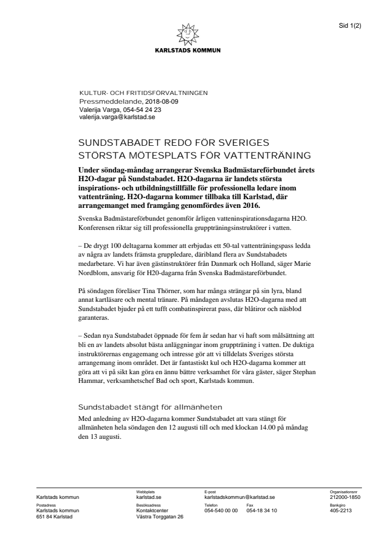 Under söndag och måndag 12–13 augusti arrangerar Svenska Badmästareförbundet årets H2O-dagar på Sundstabadet. H2O-dagarna är landets största inspirations- och utbildningstillfälle för professionella ledare inom vattenträning. H2O-dagarna kommer tillbaka till Karlstad, där arrangemanget med framgång genomfördes även 2016.