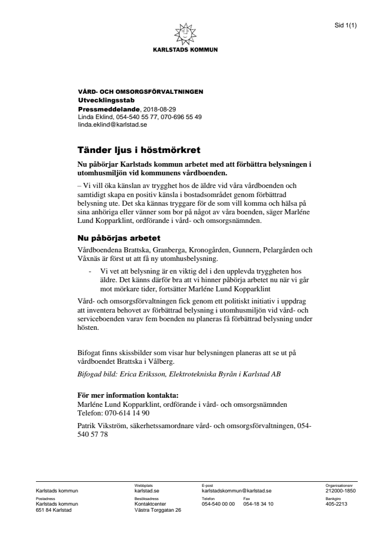 Nu påbörjar Karlstads kommun arbetet med att förbättra belysningen i utomhusmiljön vid kommunens vårdboenden.