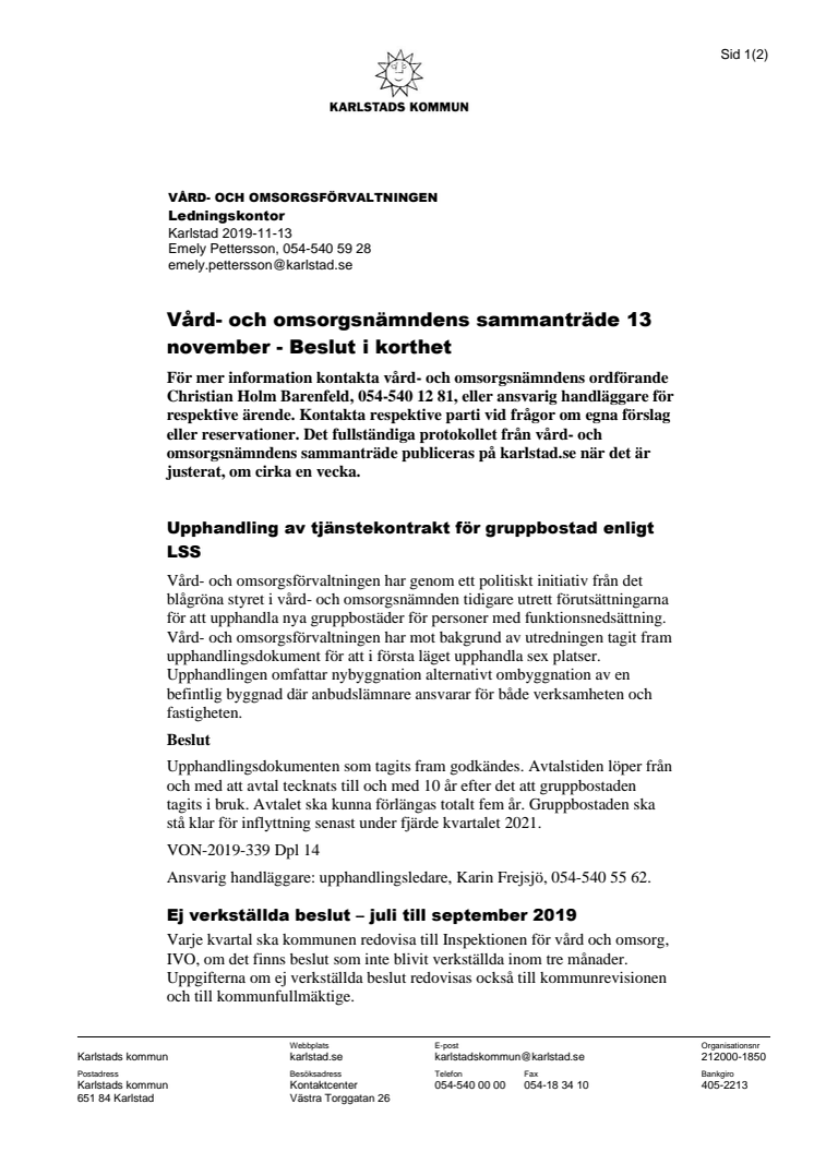 För mer information kontakta vård- och omsorgsnämndens ordförande Christian Holm Barenfeld, 054-540 12 81, eller ansvarig handläggare för respektive ärende. Kontakta respektive parti vid frågor om egna förslag eller reservationer. Det fullständiga protokollet från vård- och omsorgsnämndens sammanträde publiceras på karlstad.se när det är justerat, om cirka en vecka.
