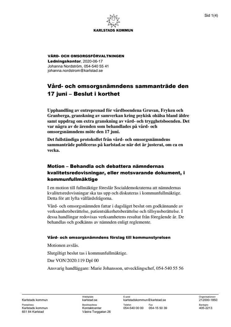 Vård- och omsorgsnämndens beslut i korthet den 17 juni